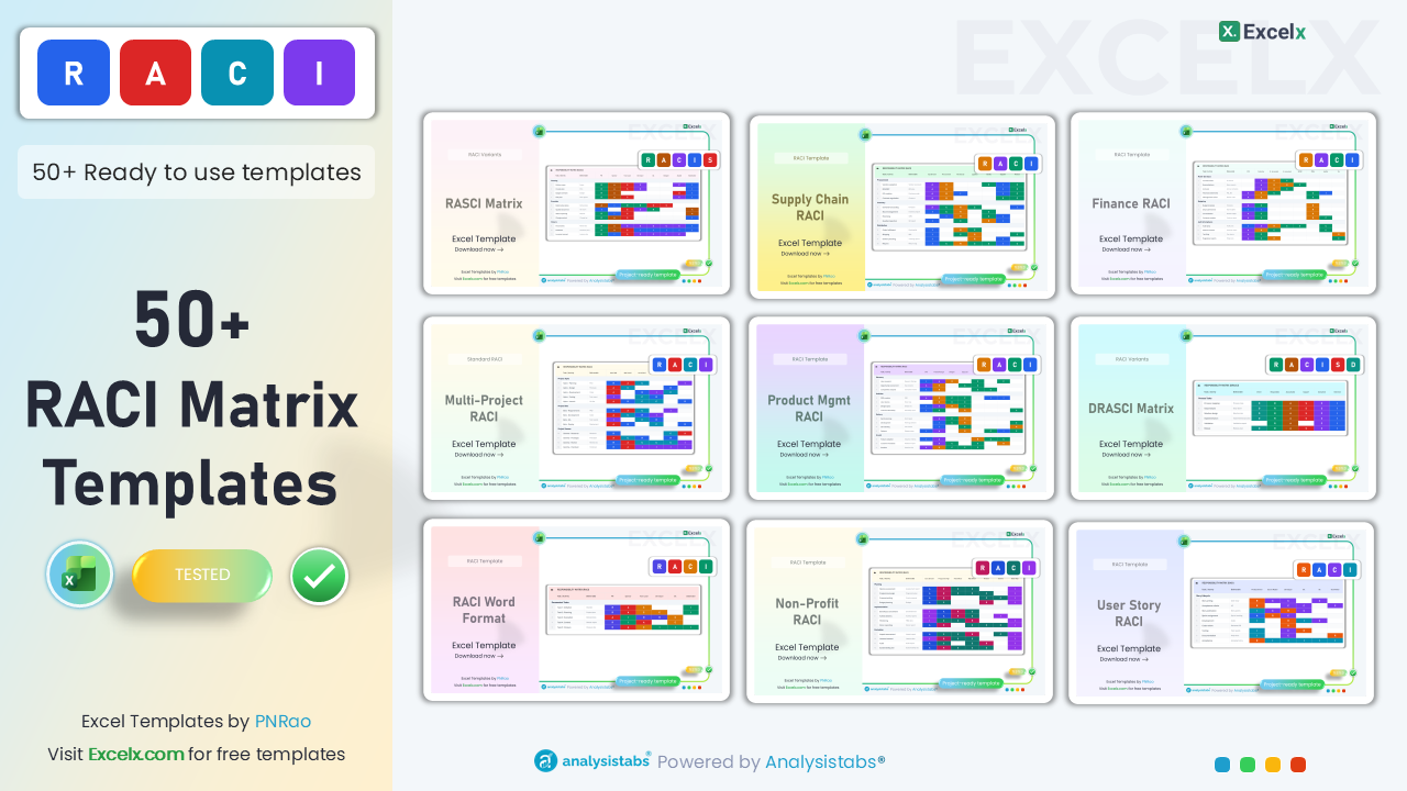 Download 52 professionally designed RACI chart templates across 8 categories. Each template includes color-coded R/A/C/I cells, dropdown validations, auto-calculated role summaries, and realistic example data — all free for Excel.